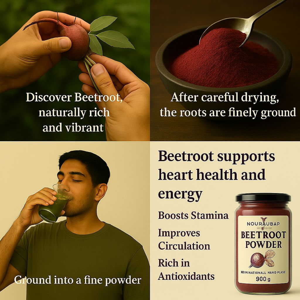 Our 100% Natural & Pure Beetroot Powder is made from fresh, chemical-free beets that are gently dehydrated and ground into a fine, vibrant powder. Packed with clean ingredients and no added sugars, colors, or preservatives, this nutrient-rich powder brings you all the natural benefits of beetroot in a convenient form.
